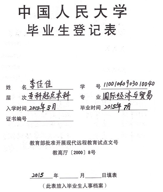 1、请于2015年6月10日前将《毕业生登记表》交回,未在规定时间内交回,影响毕业后果自负。