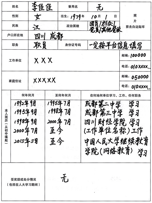 1、没有的项目填写“无”不得空项。注:如有工作单位,职务一栏不得填“无”。
