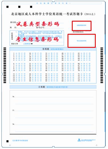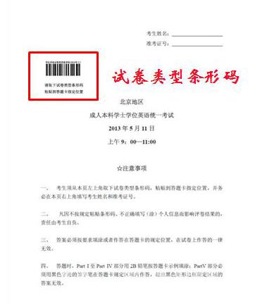 从2008年4月开始北京地区成人本科学士学位英语统一考试实行网上阅卷,且从2013年5月开始学位英语考试开始实施“一题多卷”,即考试试题相同,题目顺序被打乱,使用相同的答题卡,以试卷上的条形码为区分。 (考生拿到试卷和答题卡后,请从试卷封面取下试卷类型条形码粘贴到答题卡指定位置。)另从2015年5月开始学位英语考试开始实行在答题卡上粘贴“考生信息条形码”,请考生拿到考生信息条形码后一并粘贴到答题卡指定位置。新的试卷样式见所附图片:北京地区成人本科学士学位英语统一考试试卷(样式)。