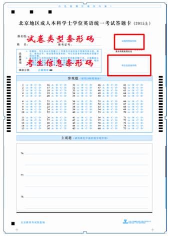 从2008年4月开始北京地区成人本科学士学位英语统一考试实行网上阅卷,且从2013年5月开始学位英语考试开始实施“一题多卷”,即考试试题相同,题目顺序被打乱,使用相同的答题卡,以试卷上的条形码为区分。(考生拿到试卷和答题卡后,请从试卷封面取下试卷类型条形码粘贴到答题卡指定位置。)另从2015年5月开始学位英语考试开始实行在答题卡上粘贴“考生信息条形码”,请考生拿到考生信息条形码后一并粘贴到答题卡指定位置。新的试卷样式见所附图片:北京地区成人本科学士学位英语统一考试试卷(样式)。