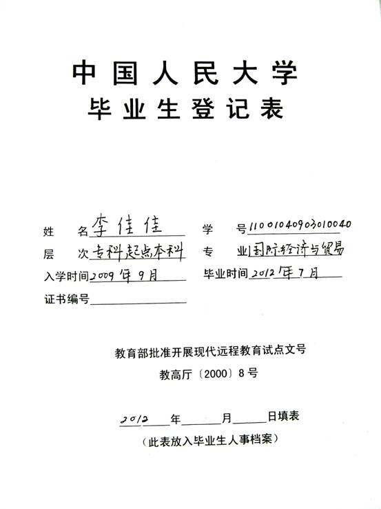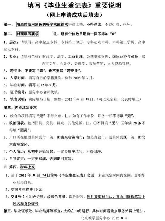 (1)《毕业生登记表》一式两份,务必于2012年8月10日-2012年8月24日期间提交(上午9:00—12:00,下午13:00—17:00),周六、周日不休息