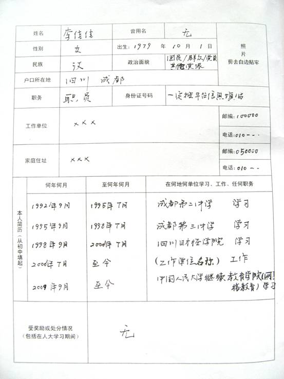3、在《毕业生登记表》中需填写“自我鉴定”(包括学习态度、学习成果、学习方法,不少于300字)及从初中开始的个人简历,请事先准备好。