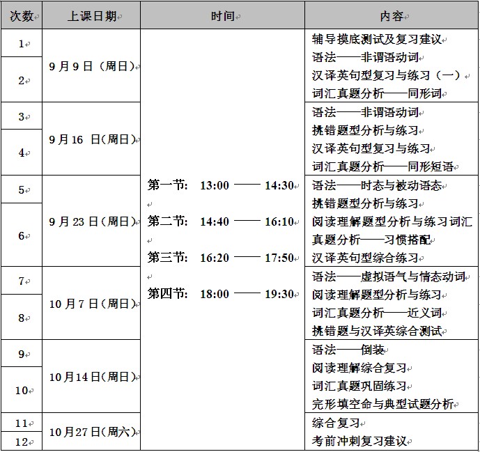 辅导时间:2012年9月9日开始,利用周六、日下午、晚上上课,十二次课,48课时。具体上课日期、时间见以下《课程表》。
