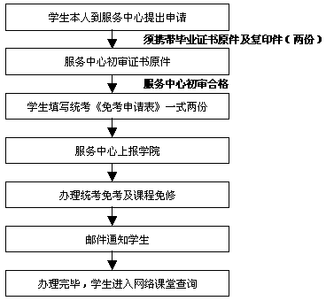 请符合上述条件的同学尽快到所属服务中心办理国家统考免考及学院课程免修的手续,办理流程如下: