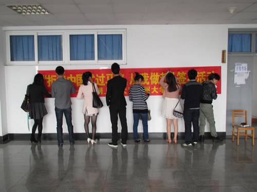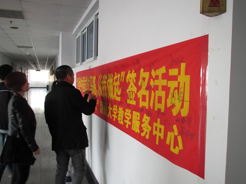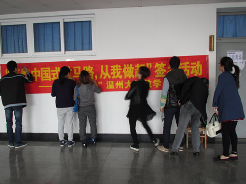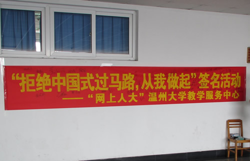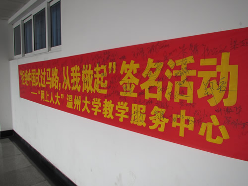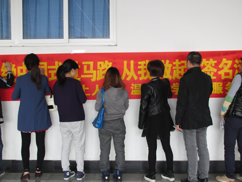 2013年4月13-14日,网上人大温州教学服务中心针对城市行人违反交通规则乱穿马路的不文明现象,举行了“拒绝中国式过马路,从我做起”的交通安全主题签名活动。活动正值网上人大201304批次课程考试,服务中心的老师在开卷考场的教室外悬挂了签名横幅,每当考试前或者考试结束后,都有学生三个一群,两个一伙儿地聚集在横幅前签下自己的保证。两天下来,大约有一百多名学生积极参与。随着考试的结束,这次别开生面的签名活动也告一段落。看着大家有秩序地站在十字路口等候交通信号灯,服务中心的老师们都感觉十分欣慰。