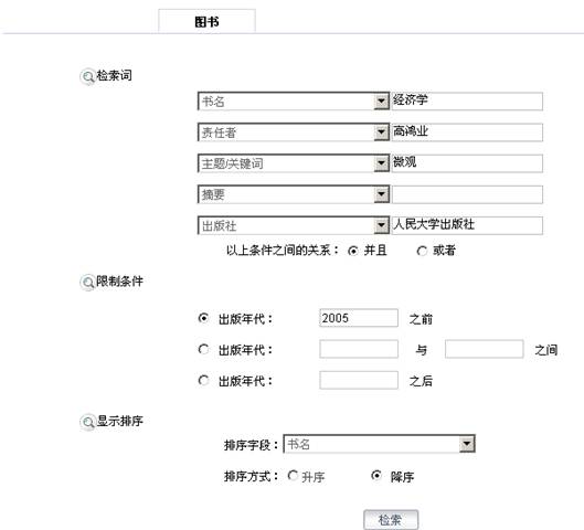选择搜索项、输入各搜索字段,选择搜索项之间的逻辑关系;选择、输入限制条件;选择结果显示的排序方式;最后,点击“搜索”。