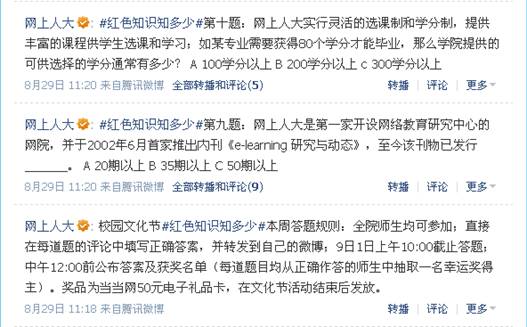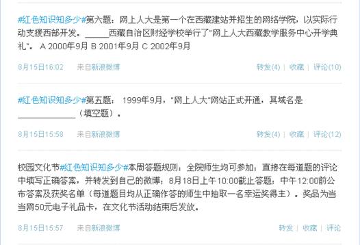 校园文化部通过新浪微博与腾讯微博这两个平台,开展了红色知识知多少的互动问答。通过六期活动,增加了学院师生对党史,对学校历史和学院的历史的了解。