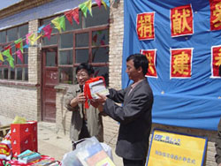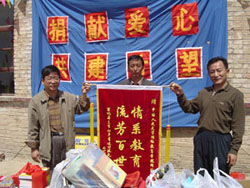 | 捐赠仪式上,顾院长把象征知识 的图书交给廷元希望小学校长。 | 廷元希望小学安校长为人大网院送上锦旗,对人大网院多年来的资助表示感谢。 |