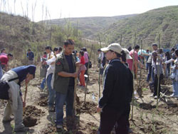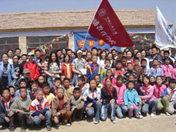 | 人大网院同学们和廷元希望小学的孩子们合影 | 热火朝天的植树场面 |