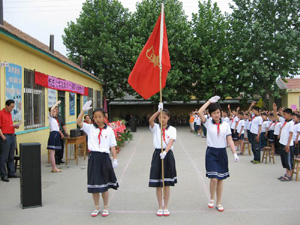 | 少先队员们用庄严的出旗仪式迎接六一儿童节到来 | 少先队员们从人大网院师生手里接过崭新的书籍 |