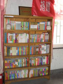 | 孙主任在捐赠仪式上发言,鼓励小学生们多读书、读好书 | 崭新的图书摆满了书架 |