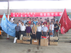 中国人民大学广西服务中心公益活动拉开序幕。5月12日清晨,虽然天空下着瓢泼大雨,但依然阻止不了给贫困学生送去关爱的行动。师生们载着对贫困学生的浓浓爱意在大雨中向武鸣县甘圩中学出发。此次共向贫困学生捐助爱心款1600元、文具200件、图书600本、衣物500件。