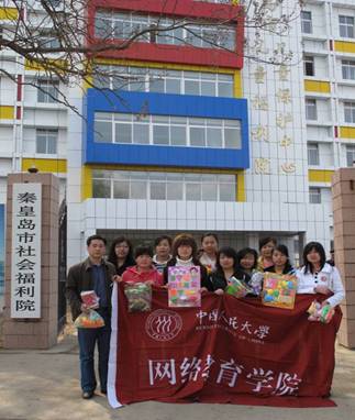 2009年4月25日上午9点,中国人民大学网络教育学院秦皇岛教学服务中心的10余名学生代表带着精心准备好的儿童日用品和玩具,到市福利院为孩子们送去关怀和祝福。