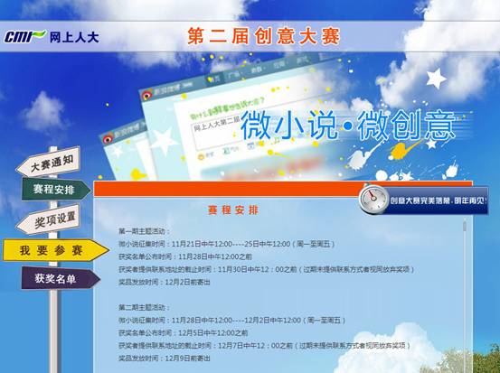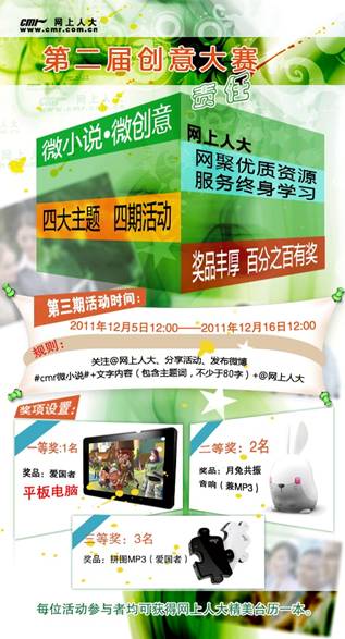 网上人大历来提倡创新与创意,去年举办了第一届创意大赛,以课程设计为创意主题,收获了不少精彩的作品。今年,第二届创意大赛又拉开了帷幕——本届大赛主题是“微小说·微创意”,历时一个多月分四期活动进行最in的“微小说”征集!